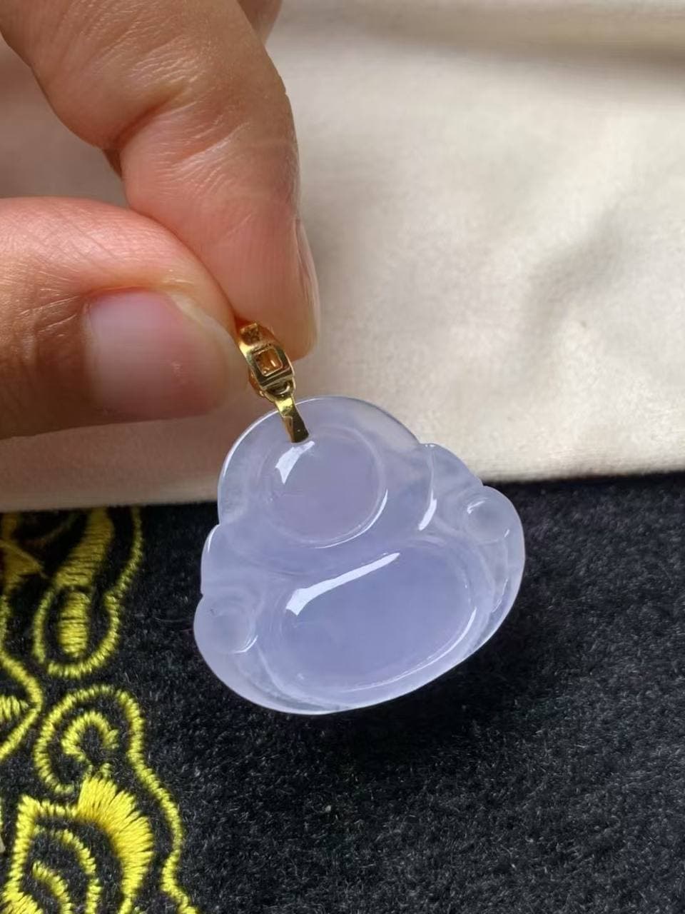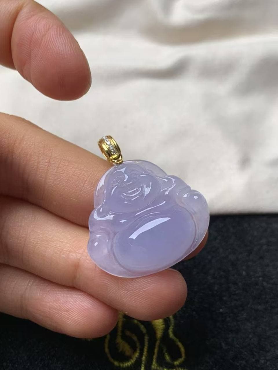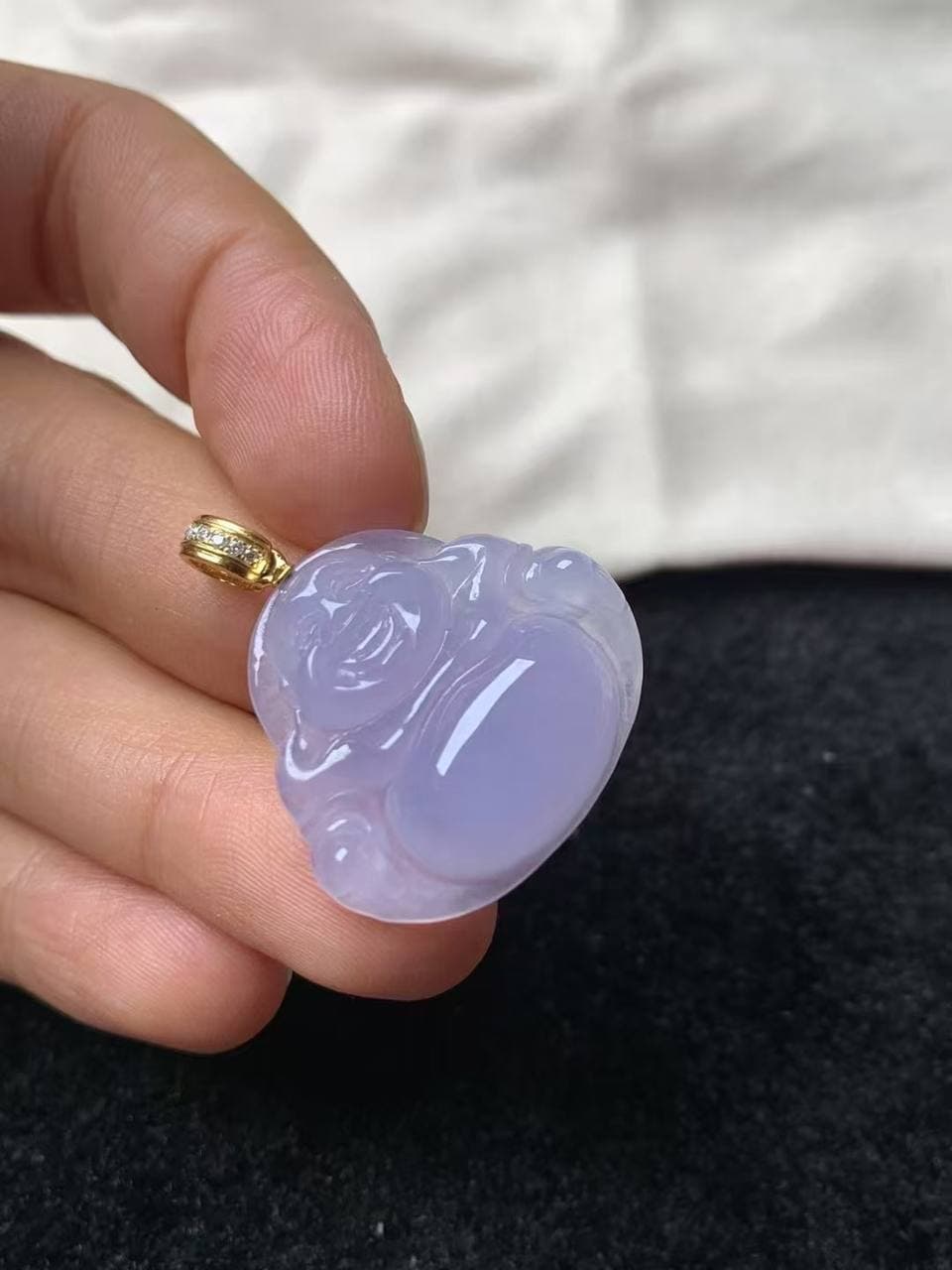 紫罗兰佛公 温润糯冰底,紫调柔和自然,宁静雅致 轮廓饱满圆润,笑意慈祥,寓意福气守护 无需镶嵌,直接佩戴,贴肤舒适又显质感 整体完美无瑕,品相优秀,收藏佩戴两相宜