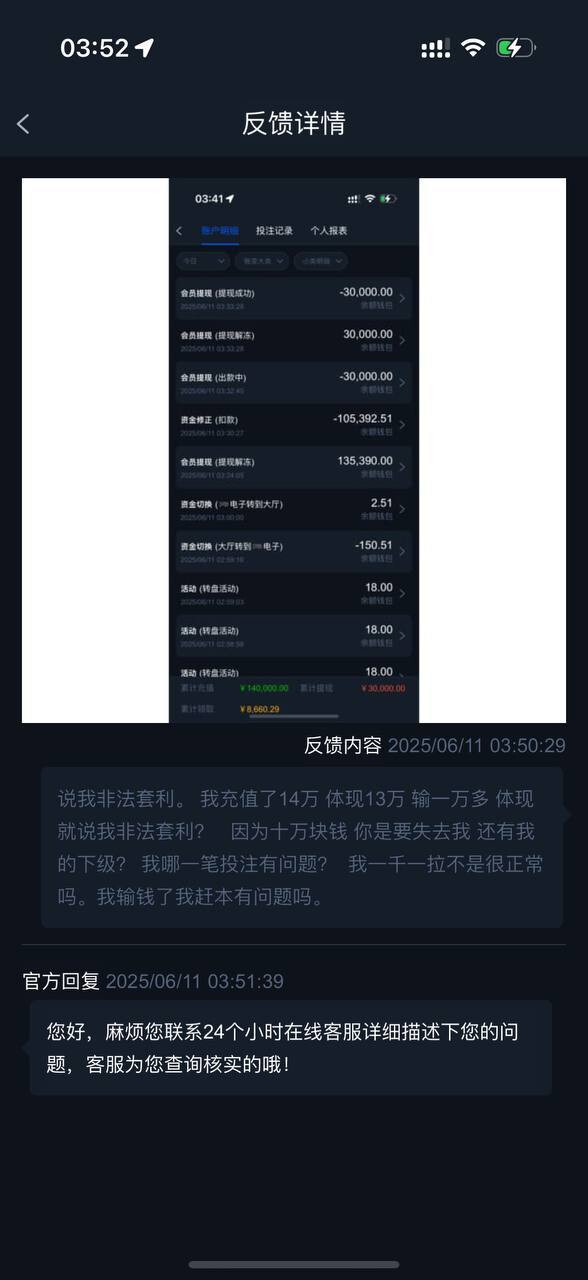 最后只退还了我最后那笔3万本金。我用这3万本金继续玩,每次5000慢慢冲,最后打到了4万5,这次居然顺利提现了。