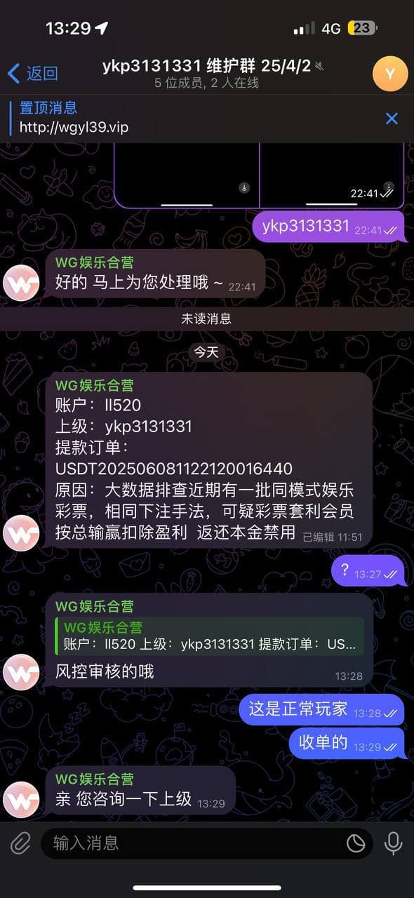 WG娱乐 黑平台,会员是真实朋友在线下收单下注的6千赢4万不给出了,前期输的时候不说,赢了之后说收单的要报备,没报备就控。