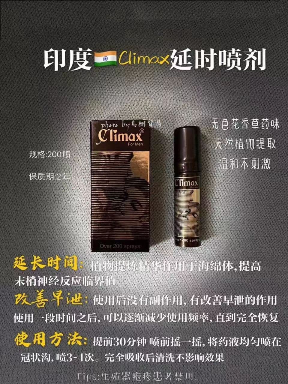 Climax Spray创始于1986年,是其最引以为傲的产品之一,其配方经过不断发展和完善,如今对房事质量的提升效果已经非常显著。喷剂为无色液体,带花香的草药气味,延时原理是其植物提炼精华作用于海绵体,提高末梢神经反应阈值。能很好地延长房事时间,Climax使用后没有副作用,改善早泄![]()