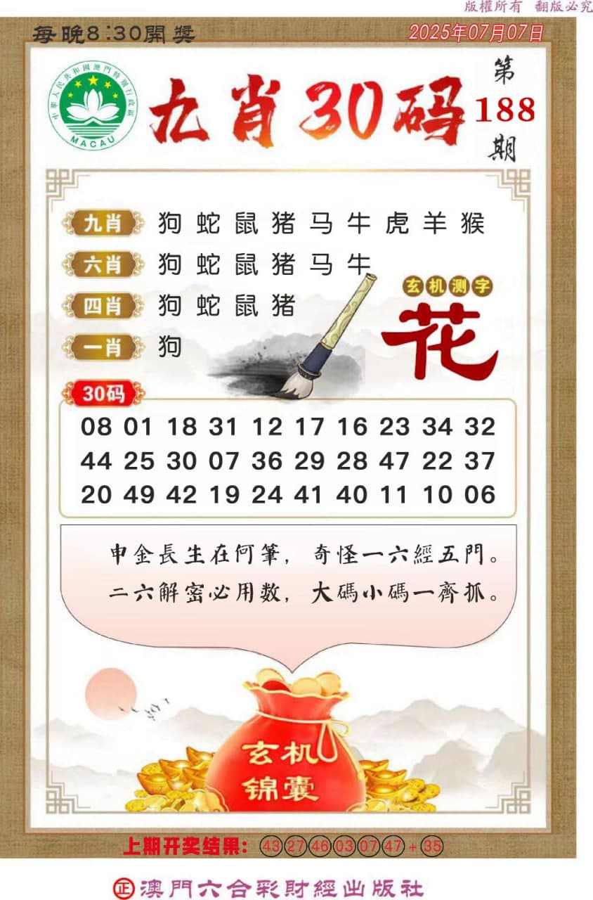 正澳门六合彩【188期】九肖30码