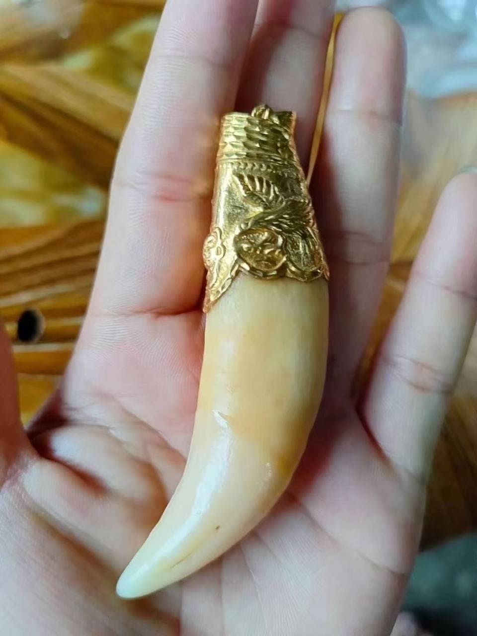 温润虎牙,裹金生雅。合规之材,承传统工艺,雕饰花鸟意。以敬畏之心赏器物