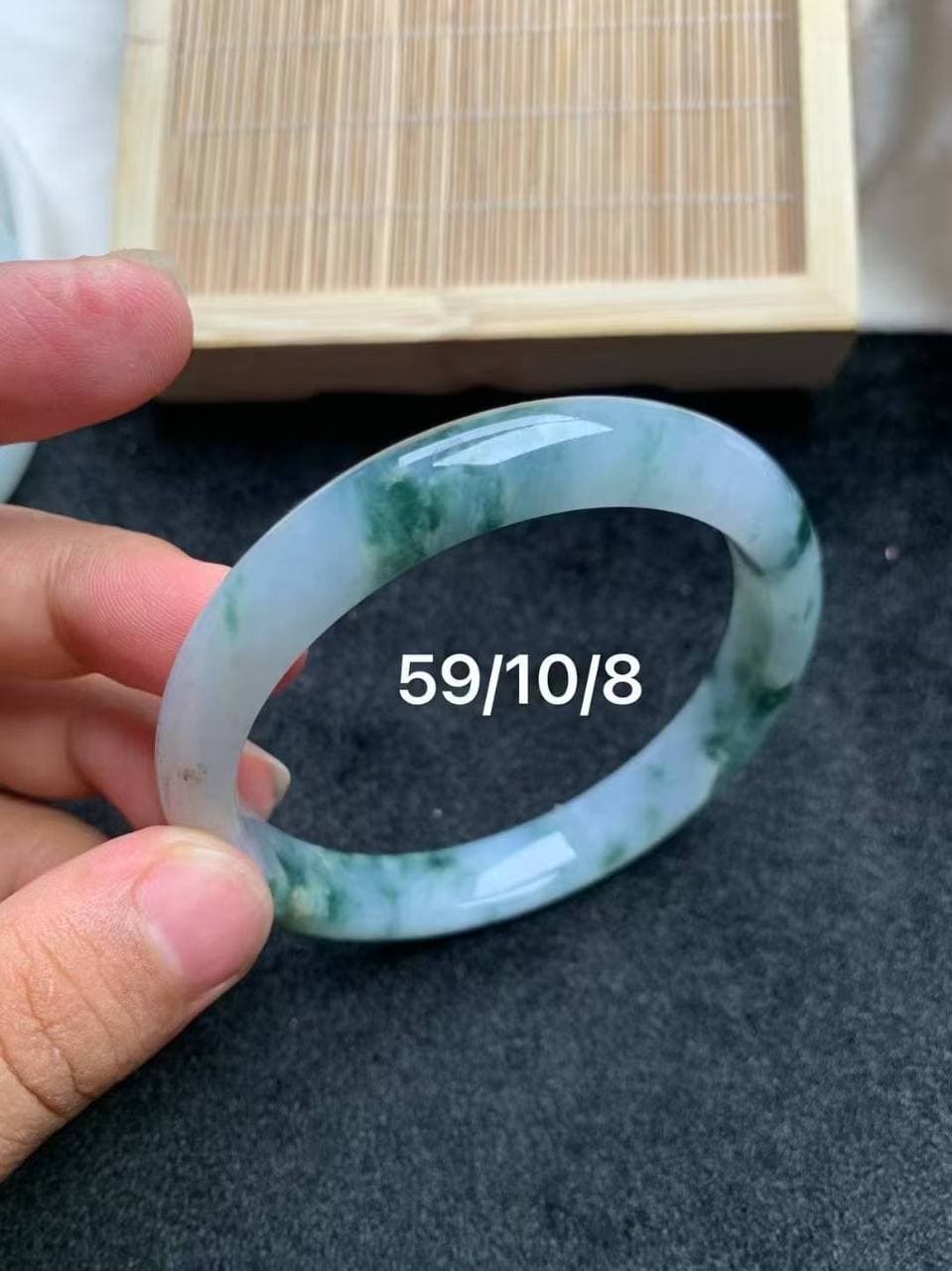 飘蓝:这通常是指翡翠中带有蓝色的飘色(即不规则的颜色分布),蓝色可能是翡翠中的一种天然色彩,或者是其他色调与蓝色相结合的表现。飘蓝的效果可以使手镯看起来更加生动,给人一种流动感。