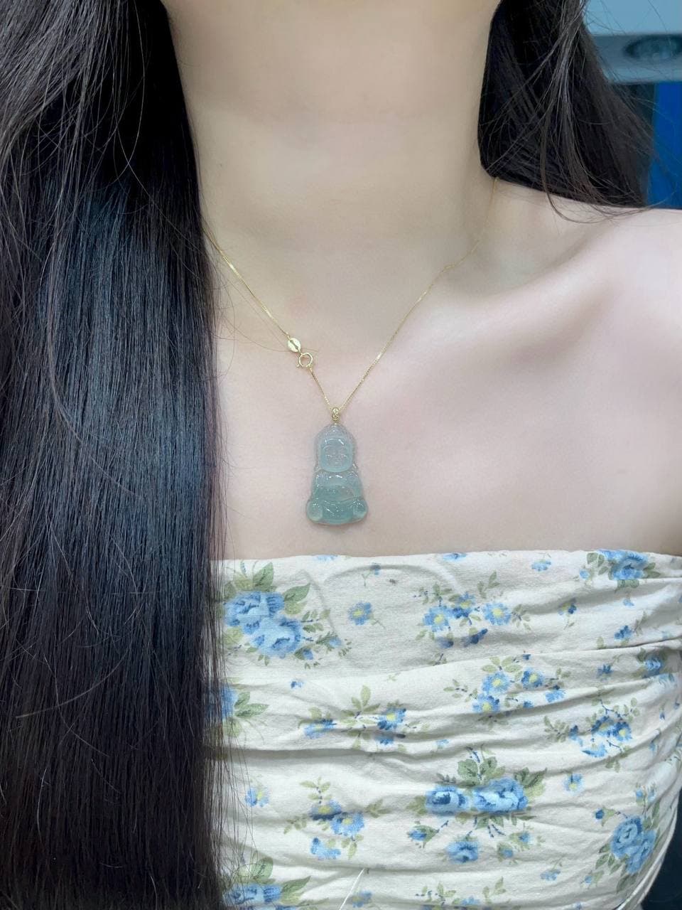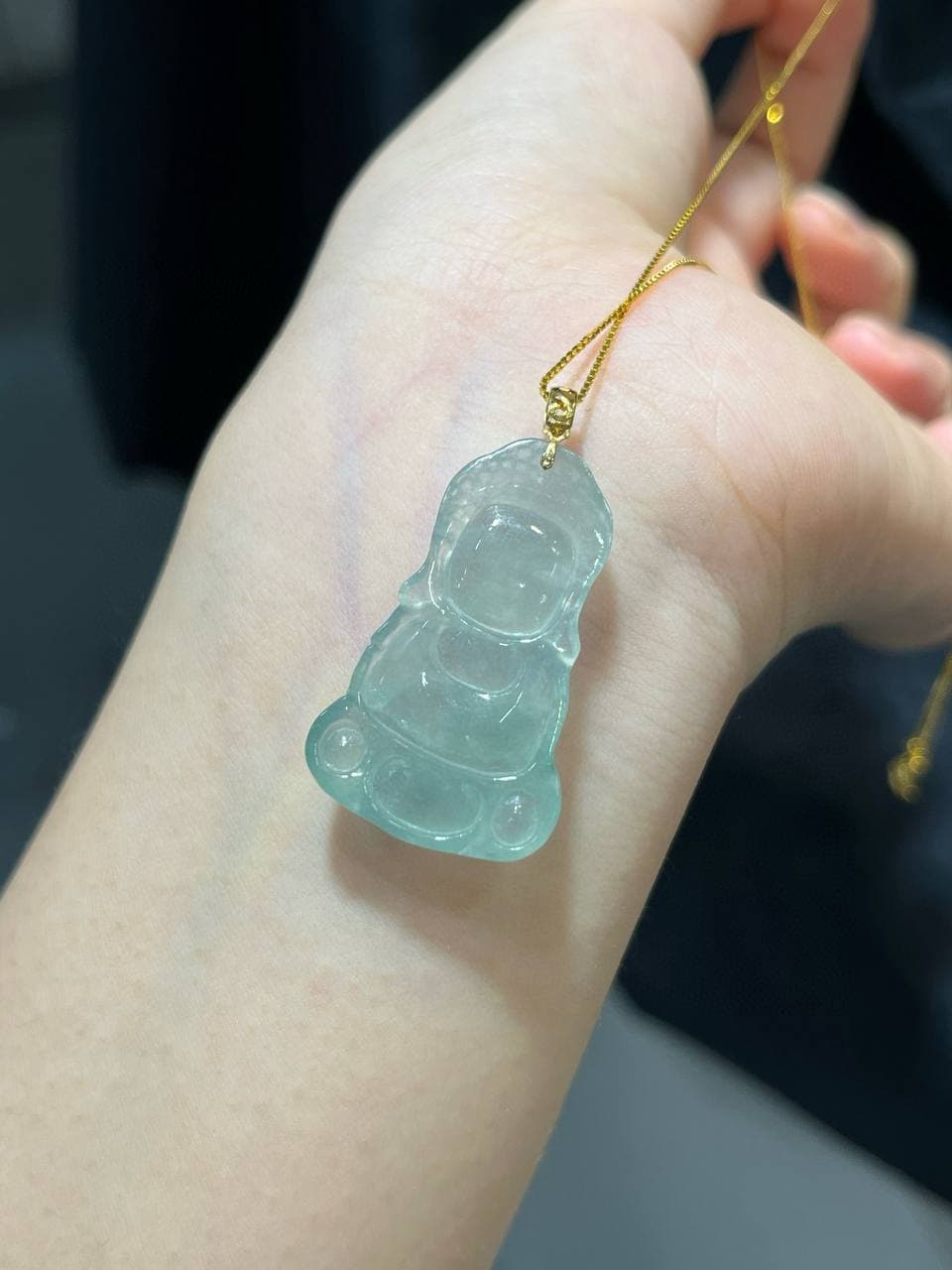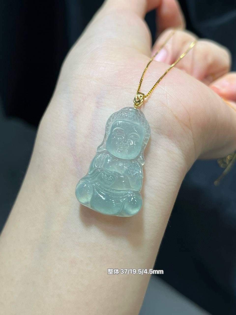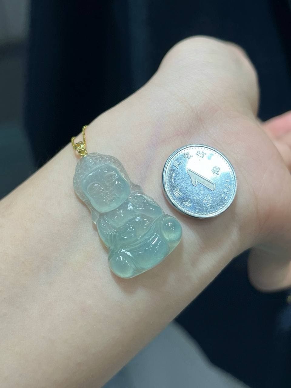 冰晴是翡翠中的一种质地,具有较高的透明度和清澈感,色泽洁净,光泽柔和。它的质地通常呈现出淡绿色或淡白色,给人一种清新、纯净的视觉感受,十分适合用于宝宝佛这一可爱形象的雕刻。