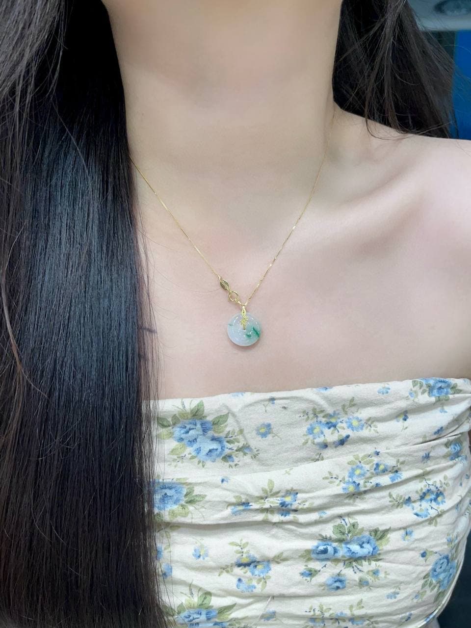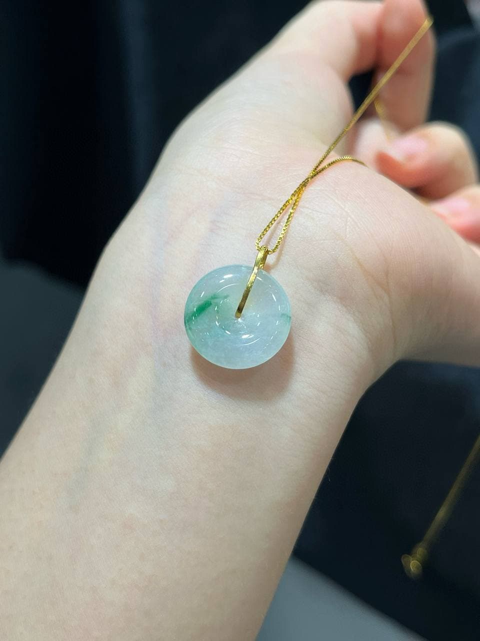 "冰飘绿·mini 平安扣项链"应该是一款小巧精致、带有翡翠“冰飘绿”色调的平安扣形状的项链。冰飘绿翡翠通常是指翡翠中带有一些轻微的白色或透明效果,给人一种冰清玉洁的感觉,这种翡翠常见于高端珠宝中,颜色清新、透明感强,看起来非常优雅。