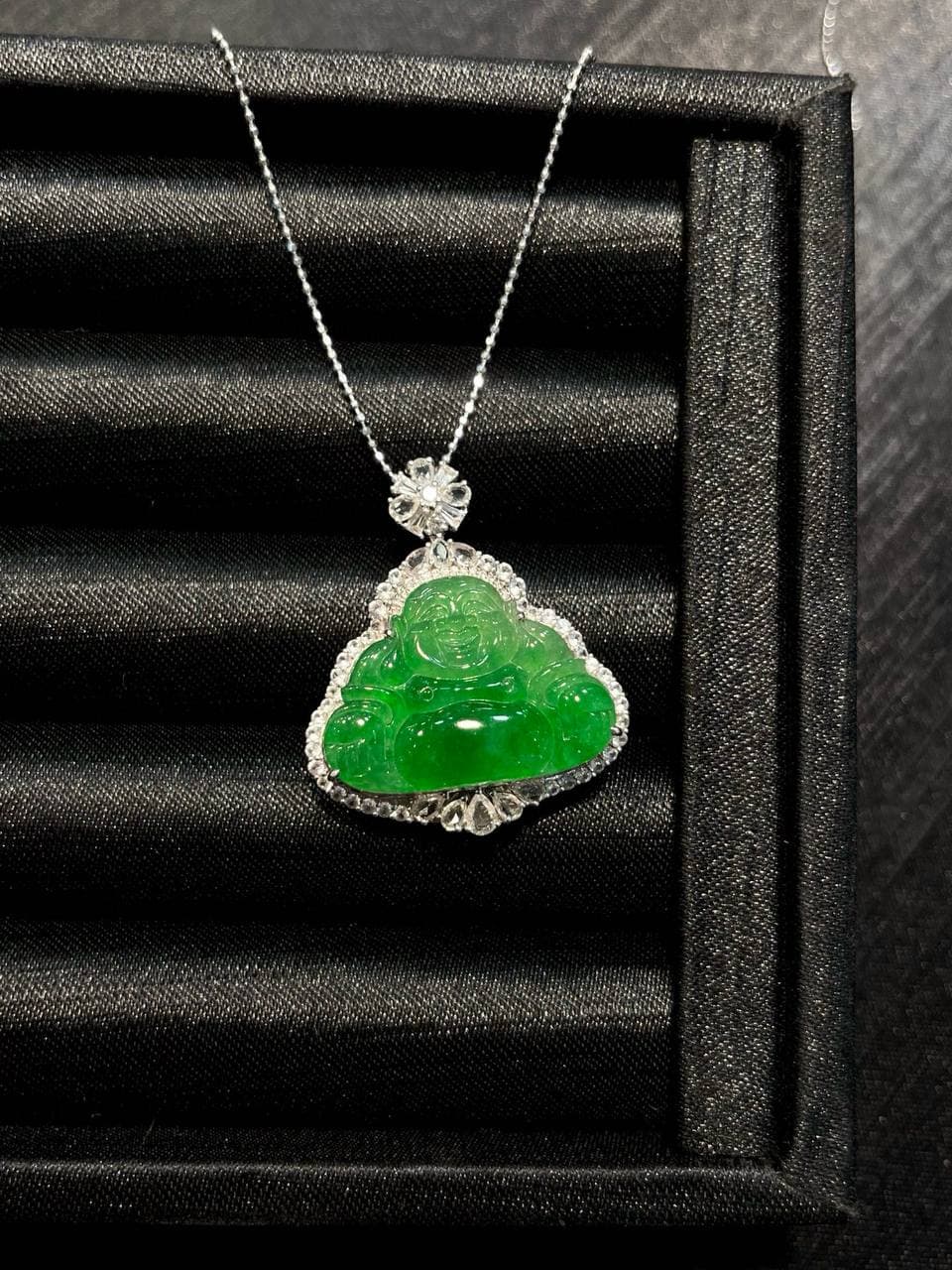 这款项链可能是结合了翡翠材质和佛公造型的设计,既展现了翡翠的美丽,又寄托了人们对好运和幸福的追求。这样的珠宝既有艺术价值,又有文化意义。