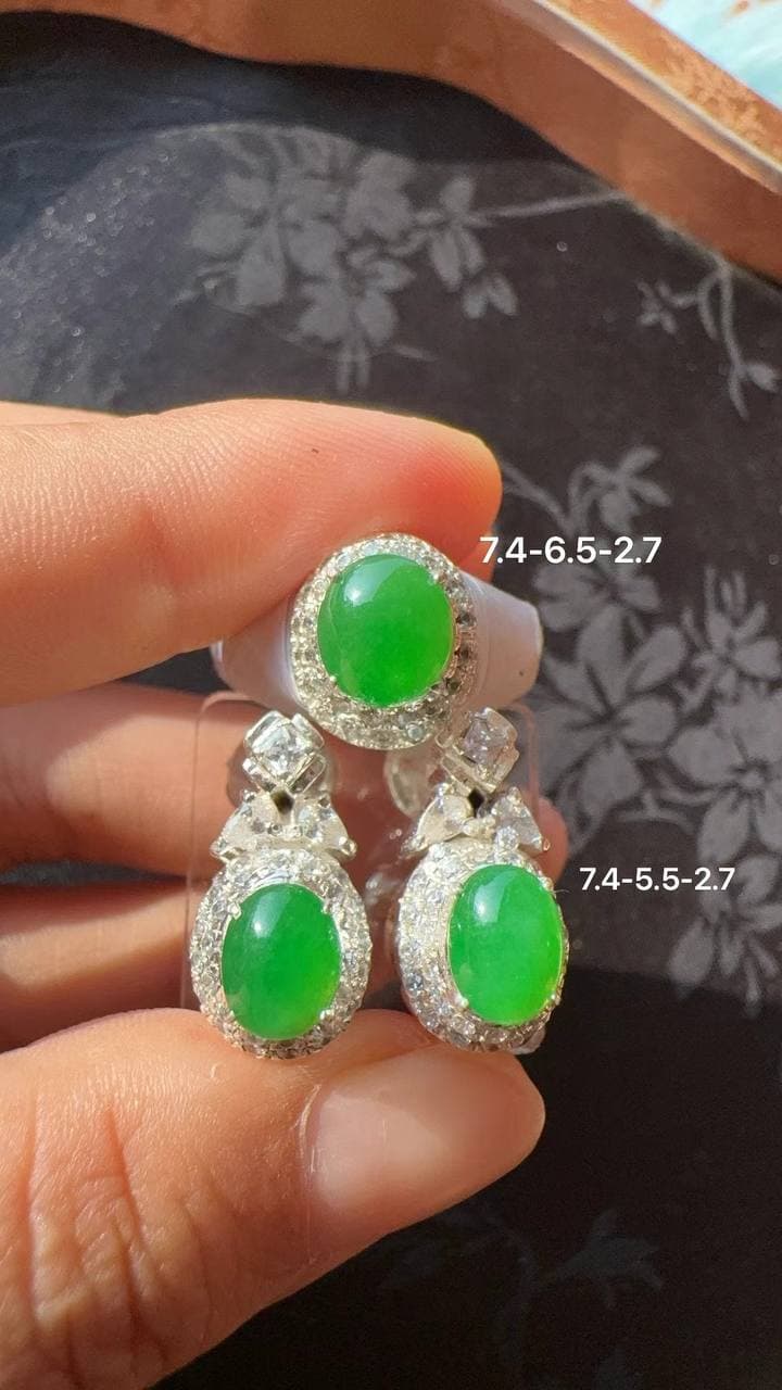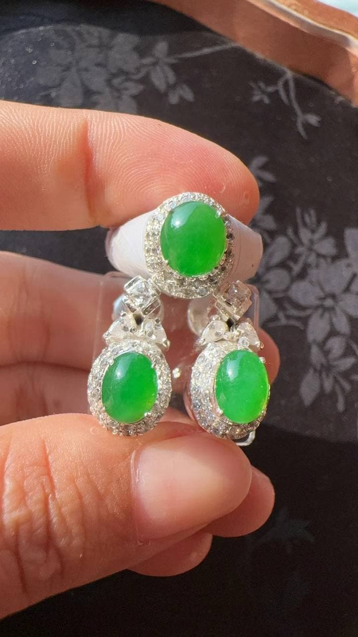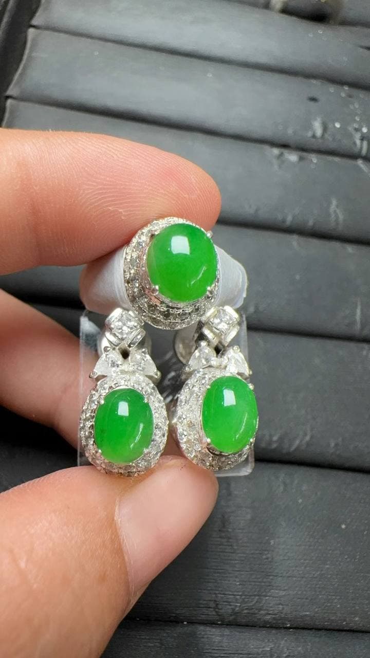 正冰·阳绿|小精品三件套 冰种清透,阳绿艳而不俗,灵动中带贵气。 成套戒指、吊坠、耳钉,形状小巧,佩戴更显气质。 色正、种好、工细,件件完美,是可遇不可求的收藏级小精致。