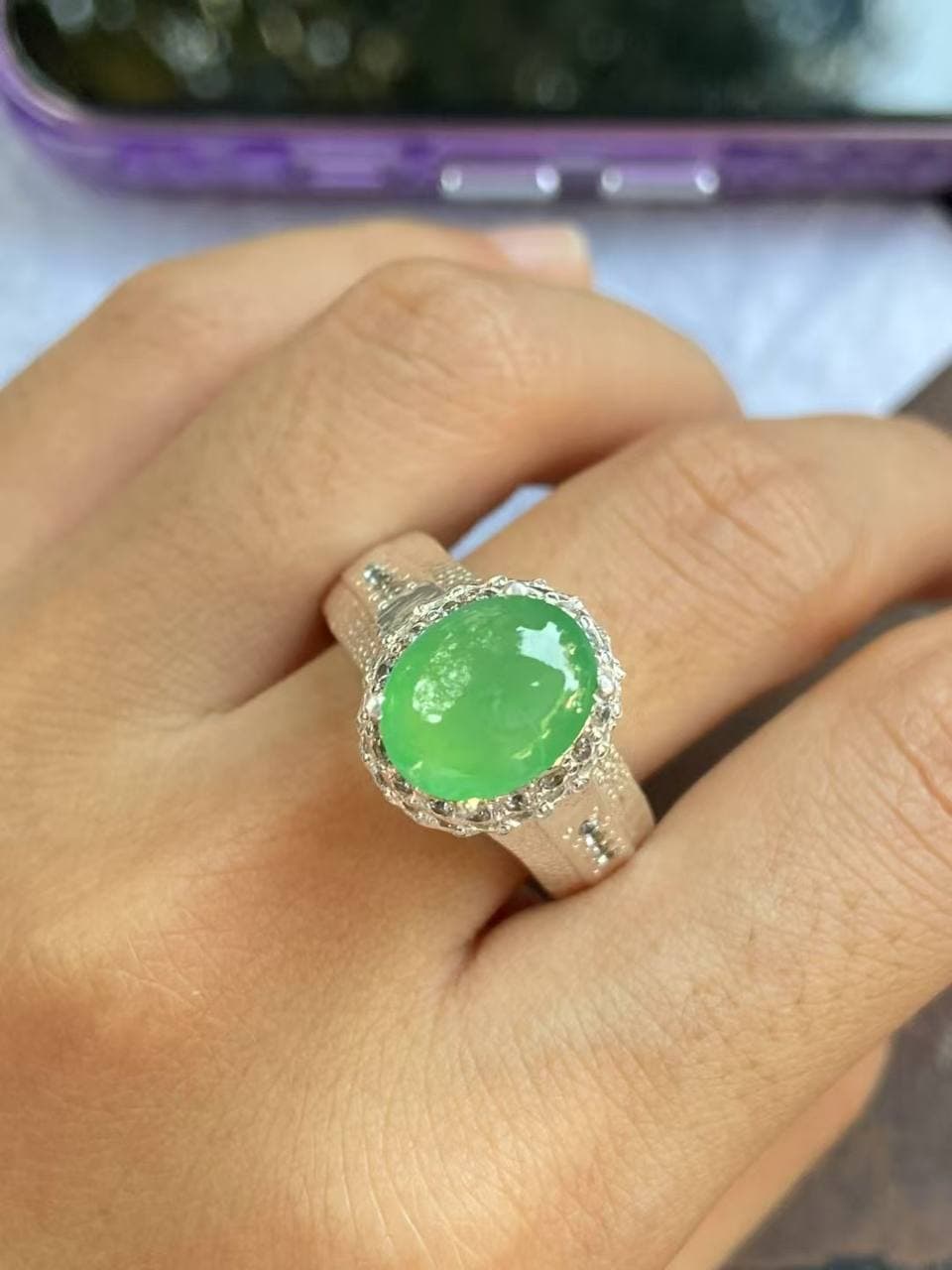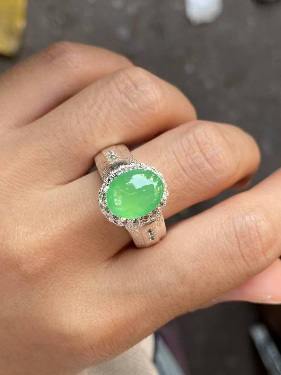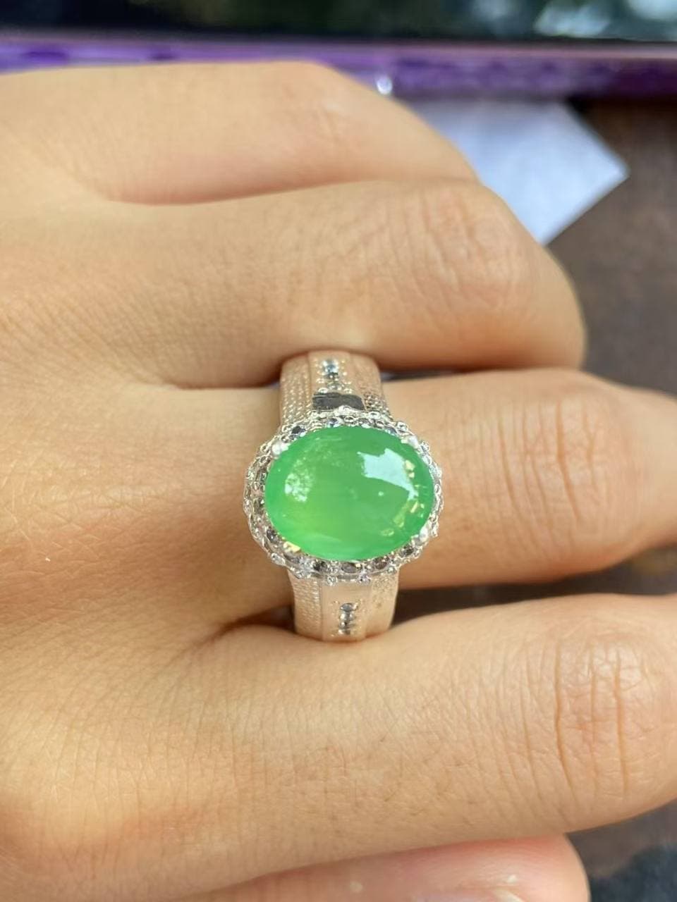 这颗翡翠戒指真的太有料了! 阳绿饱和度在线,种好、底净、胶感强,实物比图更惊艳 钻石围镶设计让整体更闪更立体,搭配宽戒臂,气场直接拉满 日常戴很有存在感,轻奢感+东方韵味兼具 不夸张地说:手上的这抹绿,是一眼就沦陷的高级感