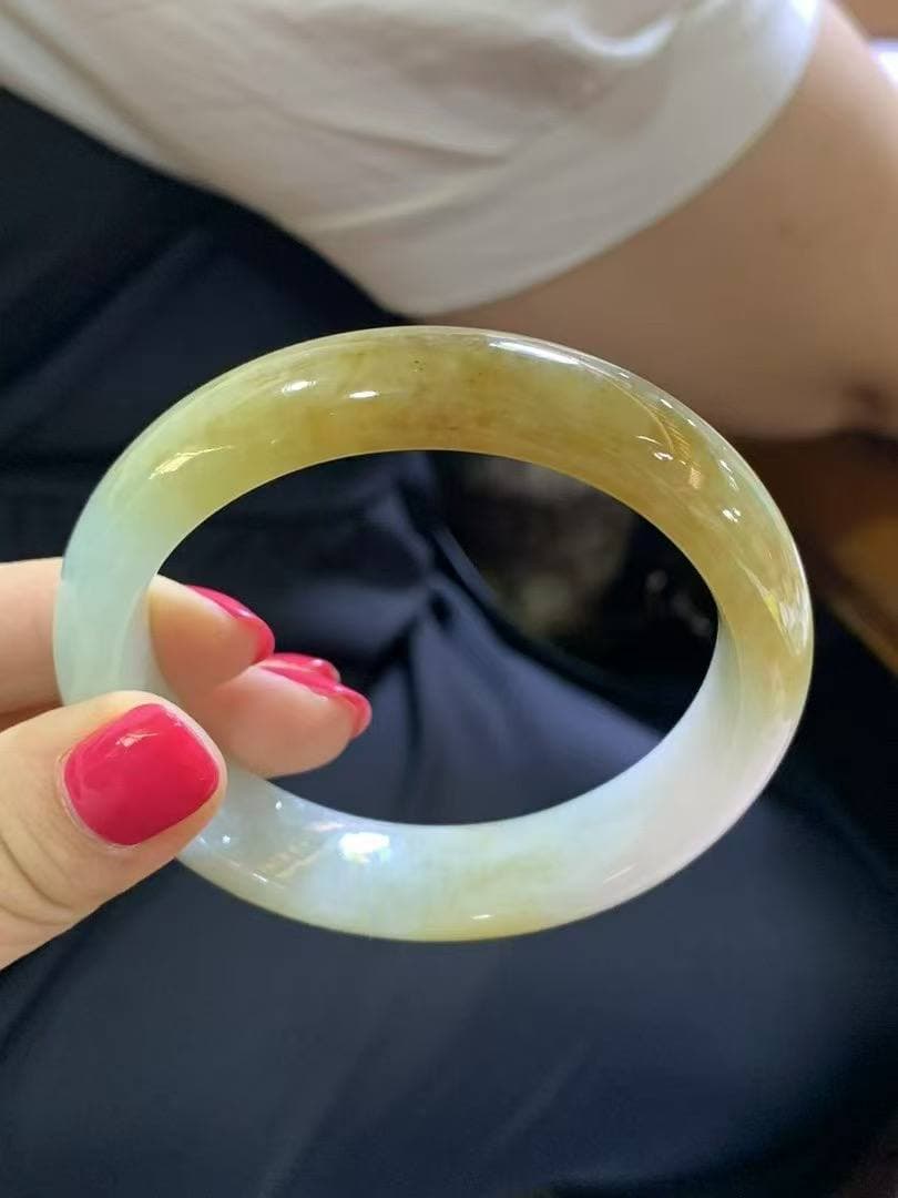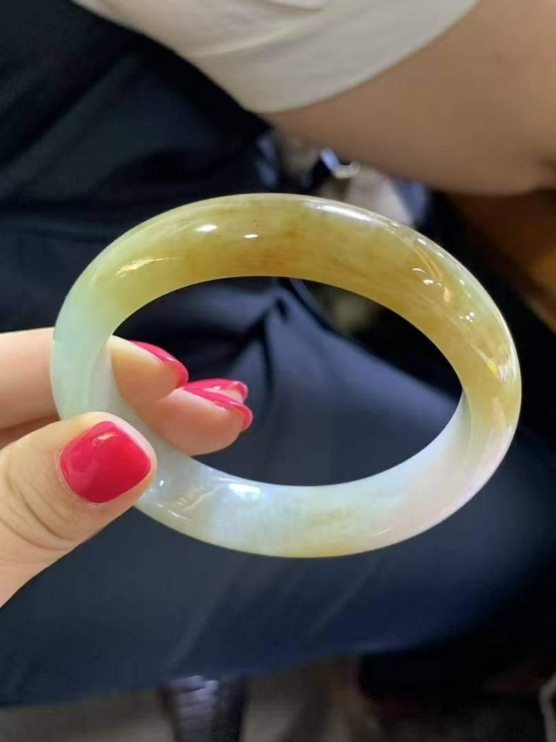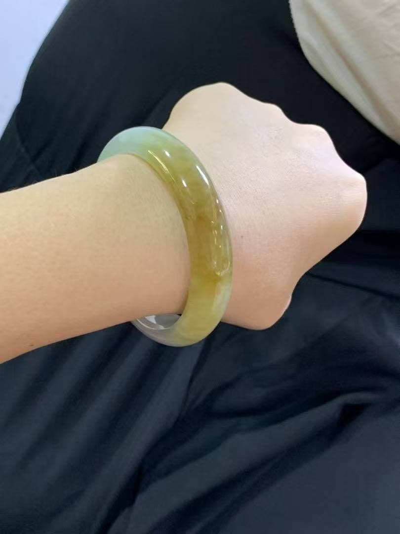 半水黄翡圆条手镯|圈口56.6|条形14.4×8.5mm|正圈56/57戴 翡翠质地半水半糯,温润清透,佩戴舒适自然~ 色泽醇厚柔和,黄翡温暖明亮,宛如日光洒金 条形大气饱满,状态完美无裂,整条干净利落,气场十足 结缘价欢迎详询~好状态的黄翡越来越少,遇见就是福气!