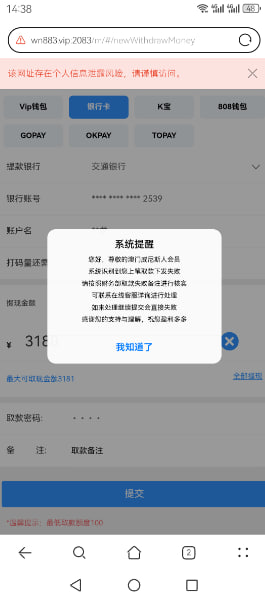 曝光黑台子【威尼斯人】黑了我3180元 取款需要充值相等金额才可以,我真信了充值了也不给出款
