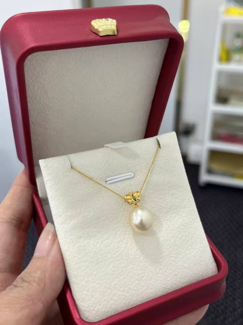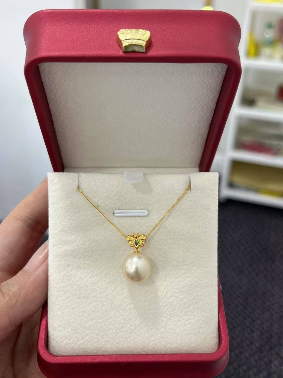 缅甸海水金珠项链|吊坠10mm|18K金镶嵌 蝴蝶福叠元素点缀,可爱感拿捏得刚刚好 香槟金珠色调温柔,珠光细腻饱满,质感在线~ 整体搭配精巧别致,细节满分不易撞款 日常佩戴吸睛又百搭,甜美中透着福气感